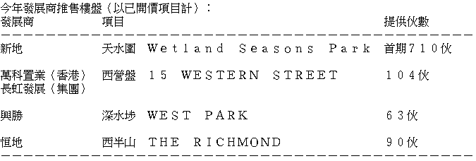 事實上,港府自去年10月放寬按揭保險計劃的樓價上限,亦適用於採用建築期付款的新盤買家,一度激起長實(01113)長沙灣「愛海頌」、佳明(01271)青衣「明翹匯」等新盤銷情不俗。不過,今年發展商推盤步伐明顯放慢,以已開價項目計,伙數較多的大盤只有新地(00016)天水圍「Wetland Seasons Park」,第一期提供710伙,餘下三個均為單幢式項目,合共提供257伙。比起市場原先預測的全年一手供應量2.7萬伙只佔不足3.6%。