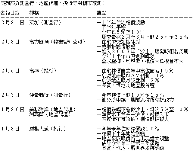 表列部分測量行、地產代理、投行等對樓市預測