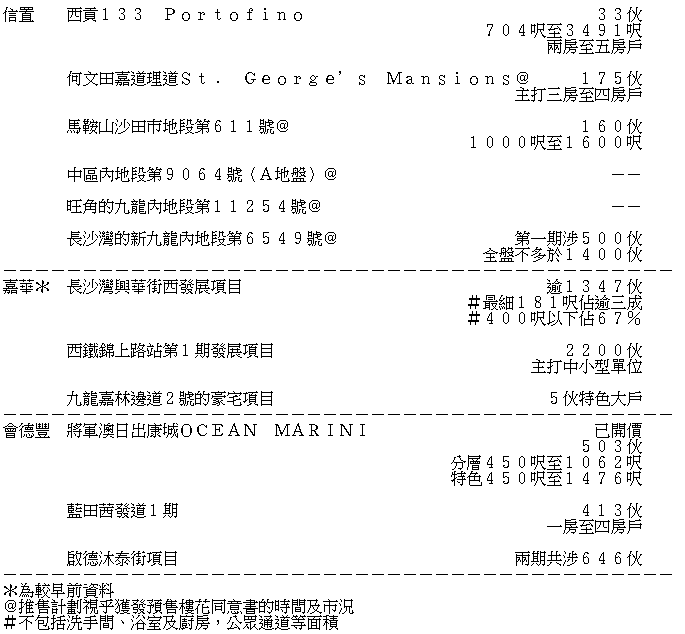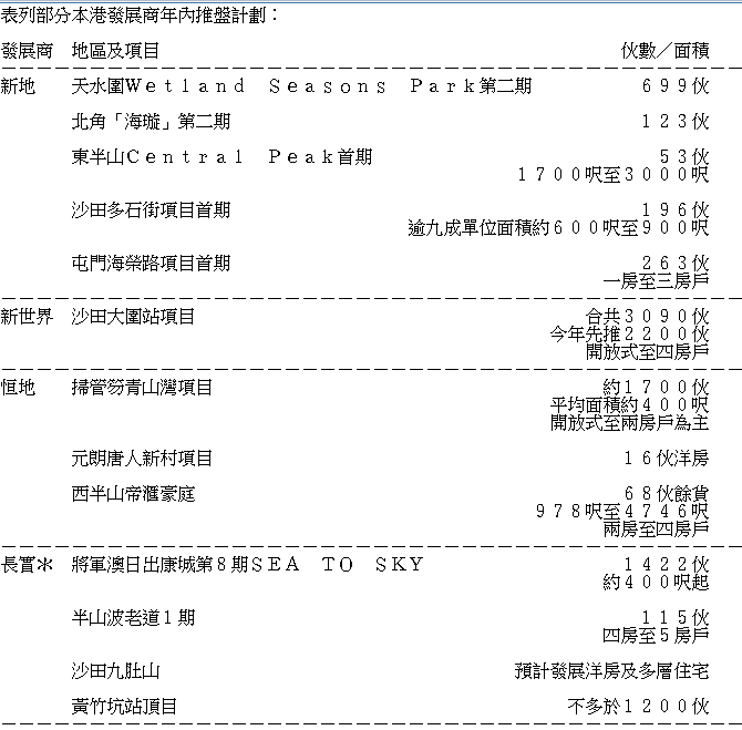 表列部分本港發展商年內推盤計劃