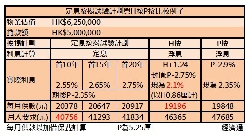 以同一貸款額500萬元的樓按(例如625萬樓價借八成)比較,同是還款期30年,選用浮息2.1厘H按(上文提過的例子),需要通過壓測,若加借按揭保費,需要月入要求為46365元。而同金額、年期的貸款,借定息10年2.55厘,不需要通過壓測,不過現行的供款與入息比率要求仍然適用,只需月入40756元即可獲批。
