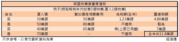 在英國,針對物業(以個人名義持有)的CGT免稅額為每報稅年度12300鎊(英鎊.下同)。免稅額後首37500鎊以基本稅率計,基本CGT稅率是18%,即最多6750鎊;其後以高稅率計,稅率是28%。