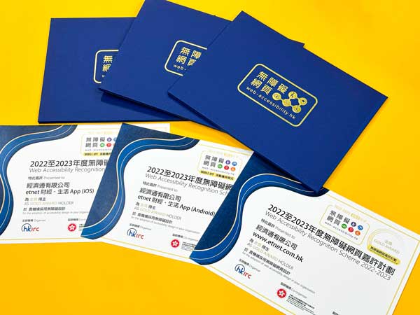 | 無障礙網頁嘉許計劃 | | 網頁無障礙設計 金獎(2022-2023) | | 流動應用程式 (Android) 無障礙設計 金獎(2022-2023) | | 流動應用程式 (iOS) 無障礙設計 金獎 (2022-2023) | |