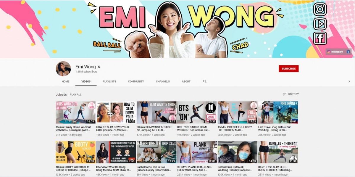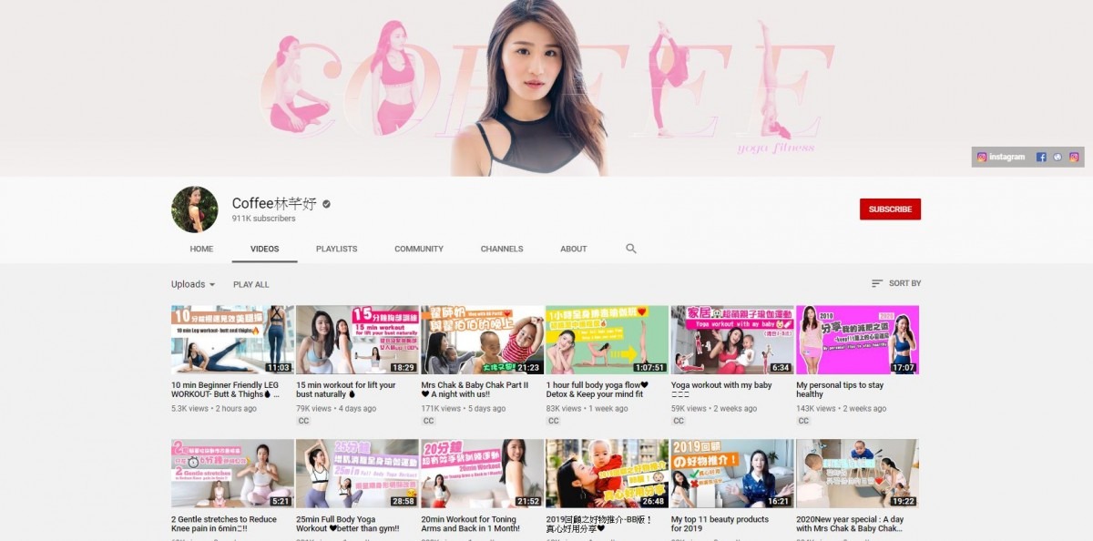 身材驕人的Coffee,即使產後亦能保持苗條身型,叫不少女生羨慕!頻道內的運動相關影片多元化且齊全,除了全身性的燃脂有氧運動,也有不少局部修身的訓練、瑜伽、伸展拉筋等,時間從5分鐘到半小時都有,且她不只示範動作,更會全程陪住你完成整個過程,只需預備一張瑜伽墊,就可以做到爆汗燃脂的效果!