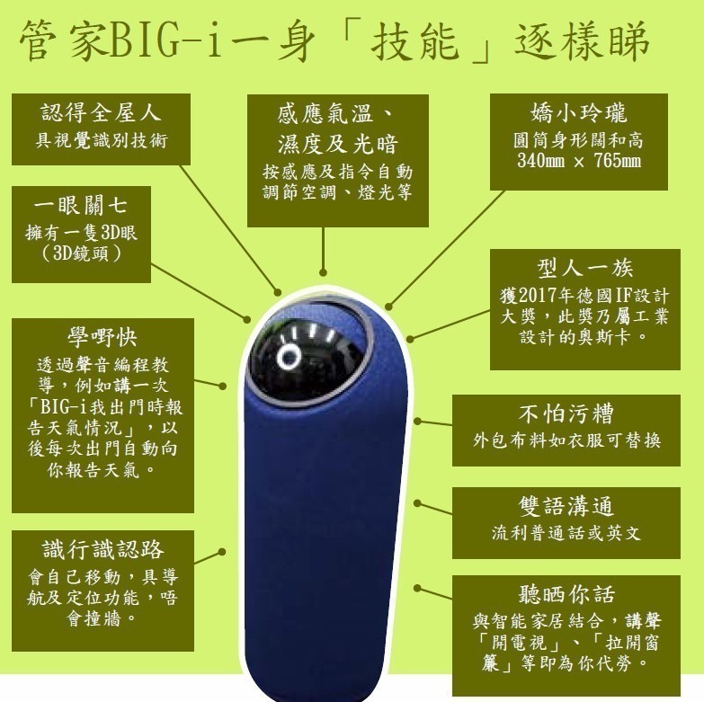 因為開發ROS,林天麟和他的團隊研發了個自家品牌的機械人,名為「BIG-i」,作為他們ROS「有形」的示範。圓筒身形的BIG-i去年更獲工業設計界頂尖的德國IF設計大獎,BIG-i的定位是家用的服務式機械人,大可理解為機械人管家,這個構想來自林天麟的親身感受,「屋企有老人家,後生要返工,有個機械人照顧,你出去打拼時,相對會放心。
