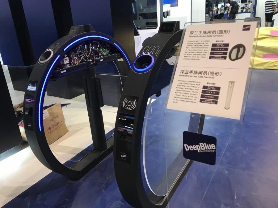 深蘭科技的手脈閘機主要靠識別手掌皮下三毫米的靜脈、血管等分布紋路來控制門禁開關。在一些禁止使用人臉識別技術的地方,手脈識別更有優勢(林雯婕攝)