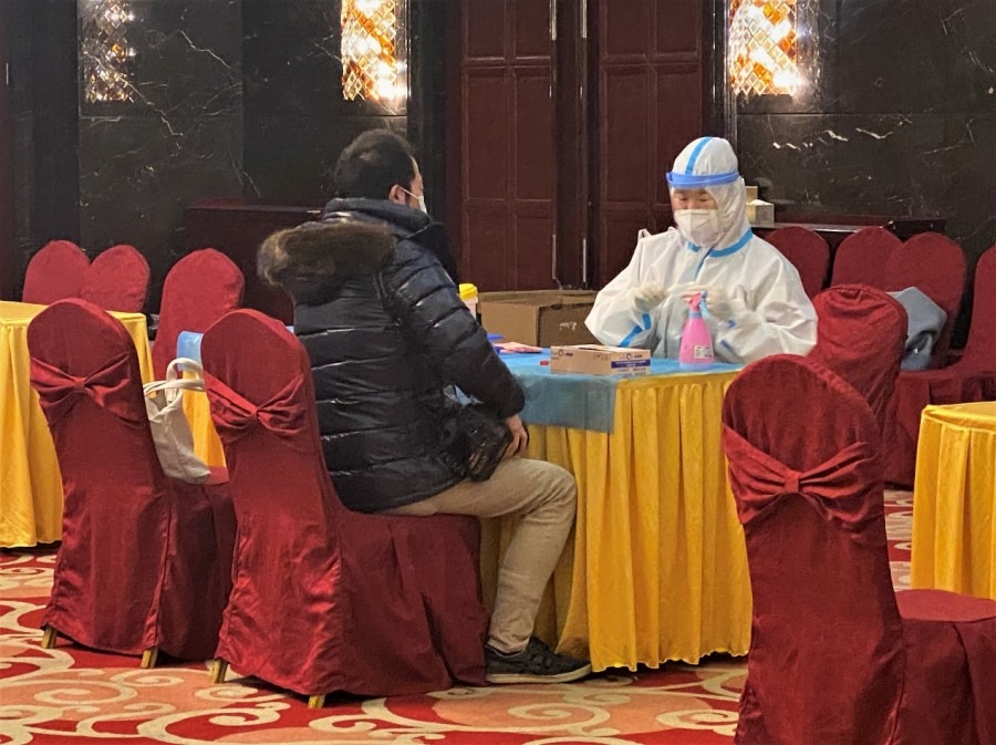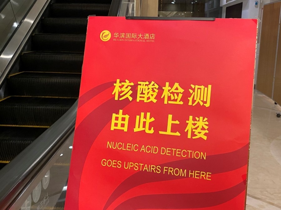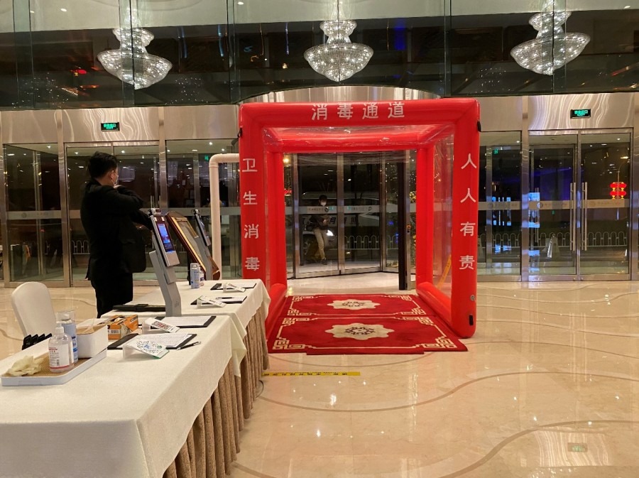 外長記者會下午3點舉行,參加記者會的境外記者需要早上6點到達西單附近的華濱國際大酒店進行核酸檢測。酒店在大門口設置了消毒通道,給進出酒店人士進行消毒。所有人在進入酒店時需要先測體溫,然後進行登記。