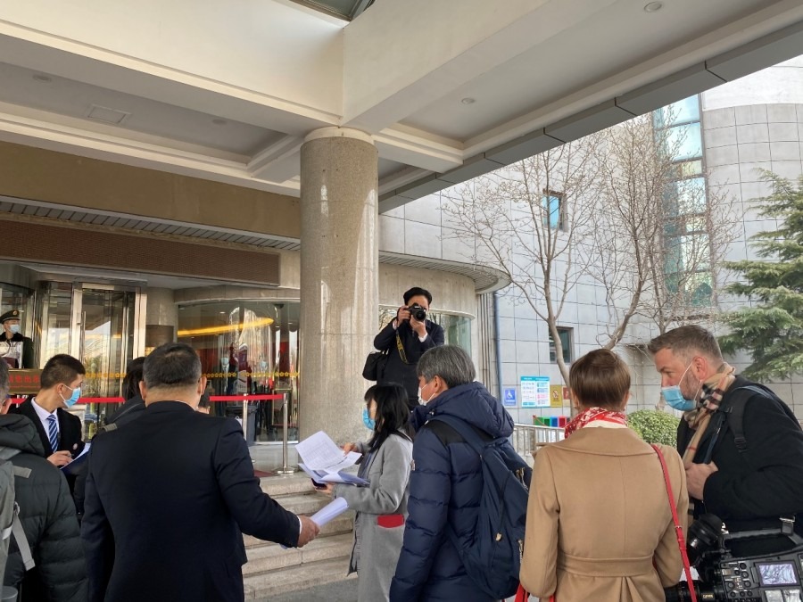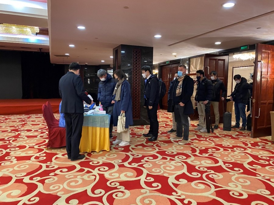 每個參會的境外記者均需要在參會當天進行核酸檢測,包括已打過疫苗的記者。檢測過後入住酒店集中進行封閉管理。核酸檢測6個小時後有結果,確定是陰性才能夠參會。檢測通過後,全體記者統一乘車前往梅地亞中心分會場,以視像連線形式參加記者會。