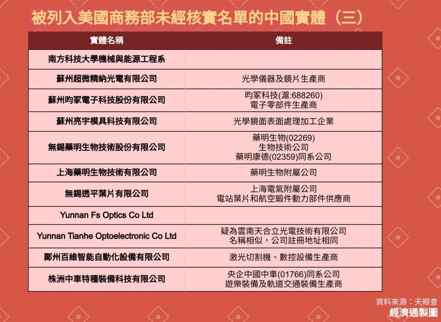 《經濟通通訊社》翻查內地工商資料,整合了最新被列入UVL名單的33家中國實體,以及與其相關的中港上市公司,表列如下: