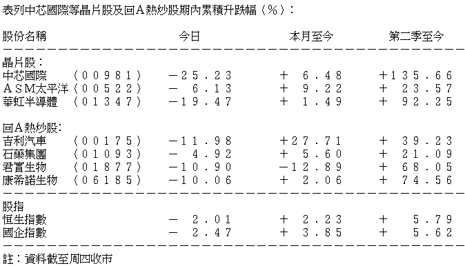 科技股地震兼回A炒作完 中芯H全日瀉兩成半