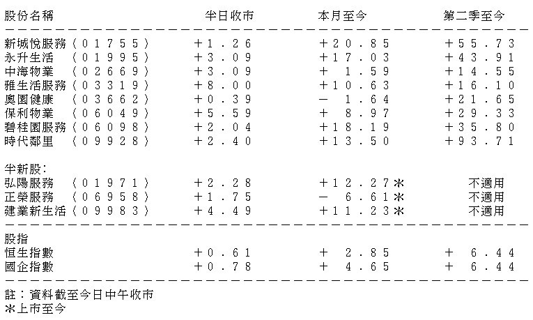 上月先後有多隻物管股配股包括佳兆業美好、綠城生活(02869)、永升生活服務(01995),以及龍頭雅生活服務獲准12個月內發行新股,拖累整個板塊由高位回落,走勢落後大市。然而經過大半個月整固,近日再次在逆市見追捧,其中碧桂園服務及新城悅服務(01755)本月至今累漲約兩成,跑贏港股及「股王」騰訊(00700)期內分別3%及5%的升幅。