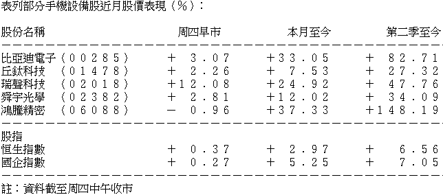其他手機設備股周四表現不一,比亞迪電子(00285)半日走高3.07%,報23.5元;丘鈦科技(01478)升2.26%,報10.86元;鴻騰精密(06088)軟0.96%,報4.12元。