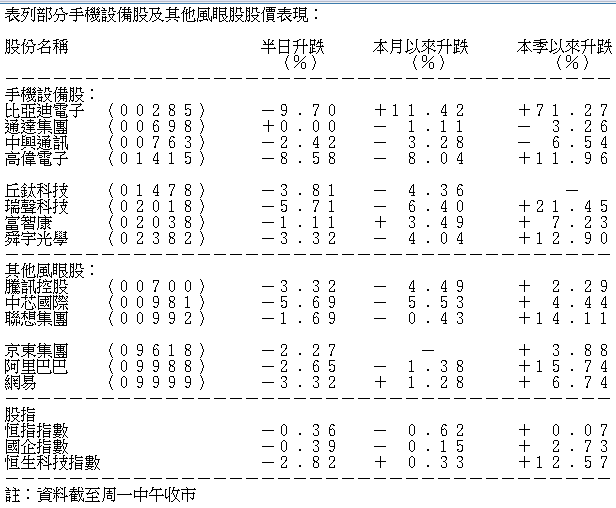 蘋果概念股全線急跌,瑞聲科技半日走低5.71%,報57.75元;比亞迪電子(00285)急挫9.7%,報30.25元;高偉電子(01415)跌8.58%,報3.09元;舜宇光學(02382)跟跌3.8%,報139.3元;鴻騰精密(06088)跌3.52%,報3.56元。