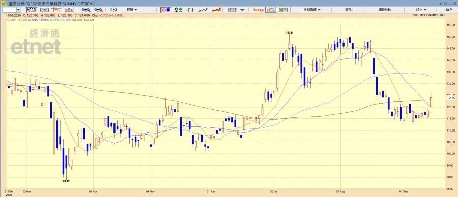 舜宇股份今日高開近2%後,升幅持續擴大,最多升6.5%,高見126元,突破近日的橫行平台區,兼重上20天線(119.995元)、100天線(123.229元)及250天線(123.484元)。半日收報4.82%,報124元。