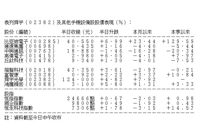 【狀態大勇】舜宇急漲半成出貨量升 比亞迪電子炒蘋果概念最搶鏡