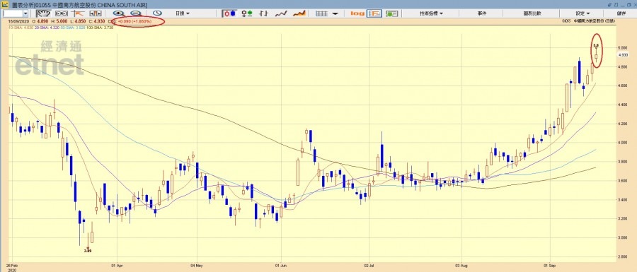 南方航空(01055)半日升1.86%,報4.93元。(經濟通HV2系統截圖)