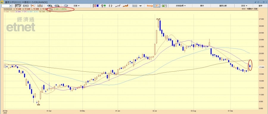 恒大(03333)滑1.96%,報17.04元。(經濟通HV2系統截圖)