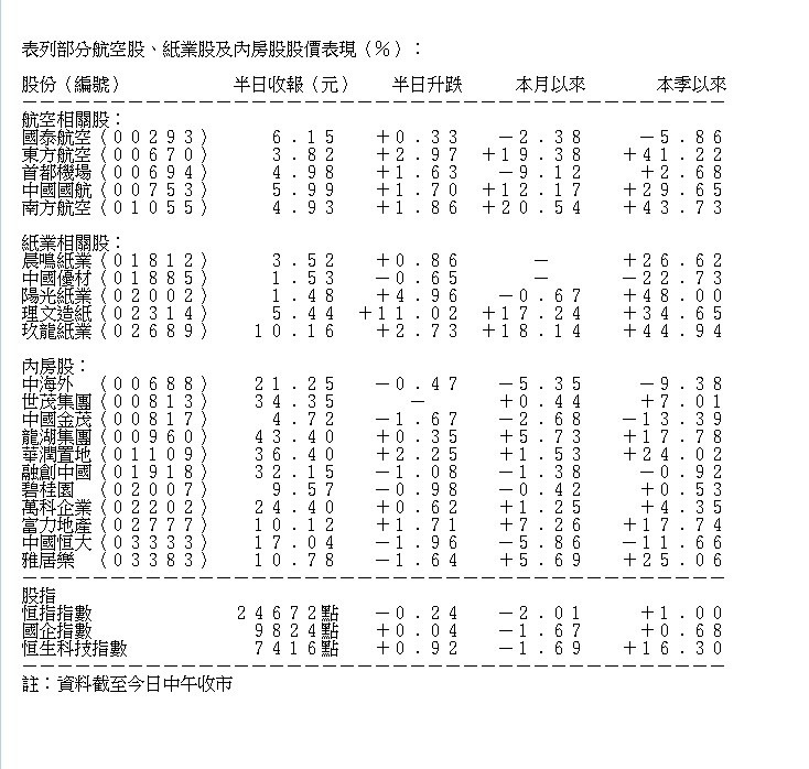 【人仔受惠股】航空股炒國慶長假三連升 紙品股迎旺季理紙飆一成