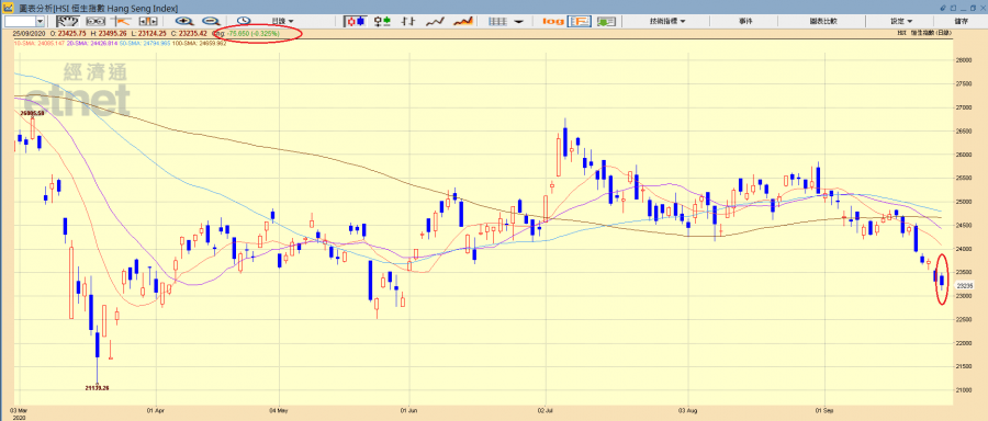 周一(21日),傳遭中國列入「不可靠實體清單」的匯控,全日捱沽,科技股隨納指走弱,澳門賭廳因中國積極打擊洗錢活動嚴重缺乏港元現金,加上賭股遭大行唱淡,多個板塊走低下恒指收挫504點,報23950點,穿二萬四關。