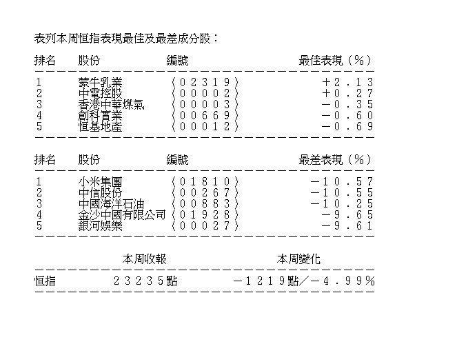 中國訪澳門自由行恢復,但瑞信唱淡賭股,指開放自由行不代表賭收會出現V形反彈,加上中國積極打擊洗錢活動,賭股下挫,金沙(01928)全周跌9.65%,報29.95元;銀娛(00027)走低9.61%,報52.2元;新濠國際(00200)插16.99%,報13.58元;永利澳門(01128)走低9.32%,報12.26元;美高梅(02282)挫12.36%,報9.36元。