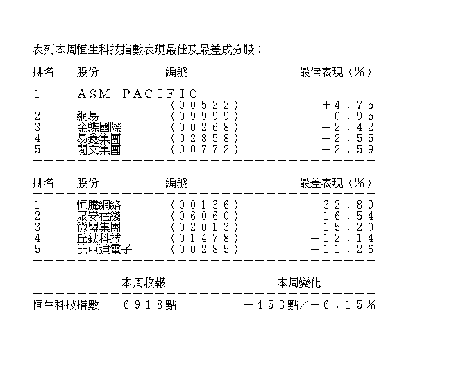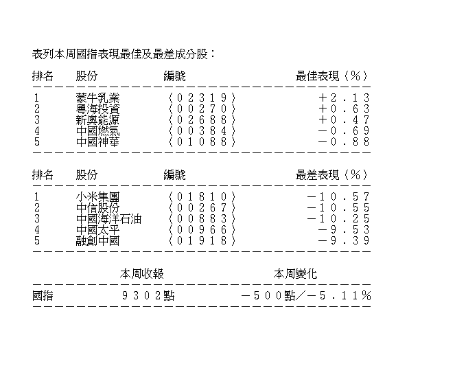 納指本周以來累跌逾3%,科指亦跑輸恒指,全周累跌453點或6.15%,報6918點,在6860點至7422點間上落。國指收報9302點,全周跌500點或5.11%,在9274點至9872點間波動。