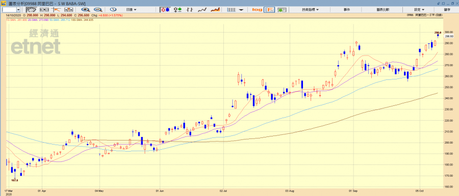 葉尚志認為,就消息面而言,螞蟻上市與內需概念最為利好阿里巴巴與美團的業務表現,如投資者欲入市,他首薦阿里,建議可於288元以上位置作波幅炒作,升至300元以上「食胡」;美團則可268元以上位置炒波幅,目標價285元以上。