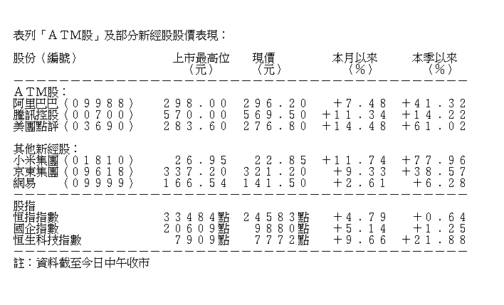 「新經濟股」逆市有追棒,阿里、騰訊及美團組成「ATM股」升勢更大。第一上海證券首席策略師葉尚志向《經濟通通訊社》表示,由於市場對螞蟻集團上市有憧憬,以及內需消費信心強勁,故仍看好「ATM股」短線仍有炒作空間。惟葉尚志提醒,愈是接近美國總統大選,投資相關股份需愈加謹慎,由於相關股份已錄一定升幅,目前只宜短線波幅炒作。
