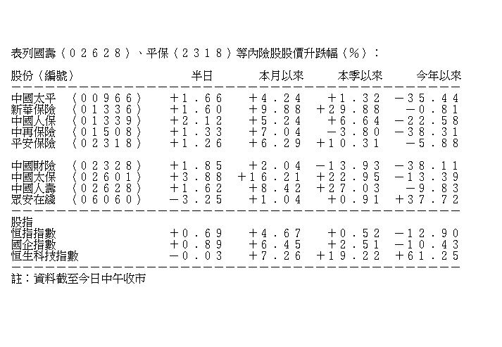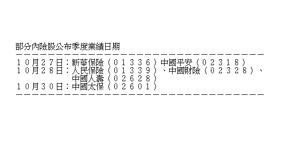平保和國壽將分別於下周二(27日)和下周三(28日)公布今年第三季業績,葉尚志預期內險股期內盈利表現不會太差,加上行業正處於復甦階段,料待明年首季才會看到顯著增長。