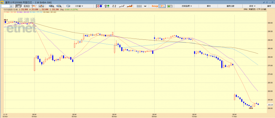 阿里巴巴連挫兩日,今日更跌破所有主要平均線。麥嘉嘉指,螞蟻集團暫緩上市令其估值將下調,加上內地網絡平台監管新政針對大型線上銷售平台,阿里旗下天貓及淘寶將為首要監管目標,故認為監管政策對阿里有較大負面影響,料將短期捱沽。建議無貨者應維持觀望至政策出台後,市場消化完負面消息才入場,低位持貨者同樣可將部分套現,其餘繼續持有。