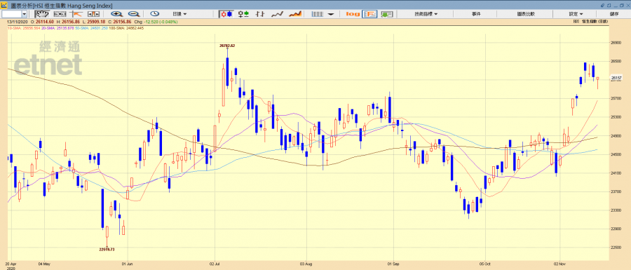美國大選結果終明朗,加上輝瑞公司指其新冠疫苗有效率高達90%,港股本周初延續上周升勢,惟中央出台反壟斷措施,資金換馬舊經濟股,科指跑輸且拖累大市,加上現任總統特朗普突簽署行政命令,禁止美國人投資於由中國軍方支持的31間中國公司股份,港股反覆向下曾失二萬六關。