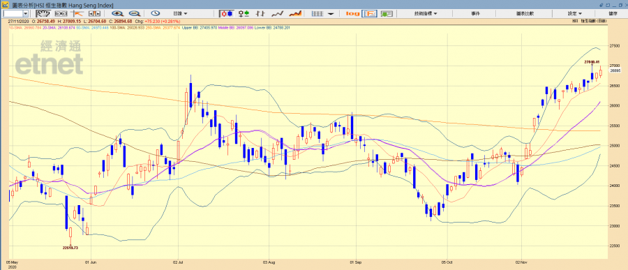 周內再有疫苗相關的利好消息出爐,英國藥廠阿斯利康聲明指,旗下疫苗最高有效率可達90%。另外,美國總統特朗普啟動對拜登權力交接,不明朗因素減少下美股反覆向上,道指在周二(24日)更突破三萬點兼創歷史新高。香港方面,有爆發第四波疫情的危機,「三桶油」和藥股因疫苗消息榮辱互見,本地銀行股則受惠派息憧憬向好;雖然周內恒指多日表現反覆,五個交易日仍全數收升,港股全周漲443點或1.68%,報26894點。