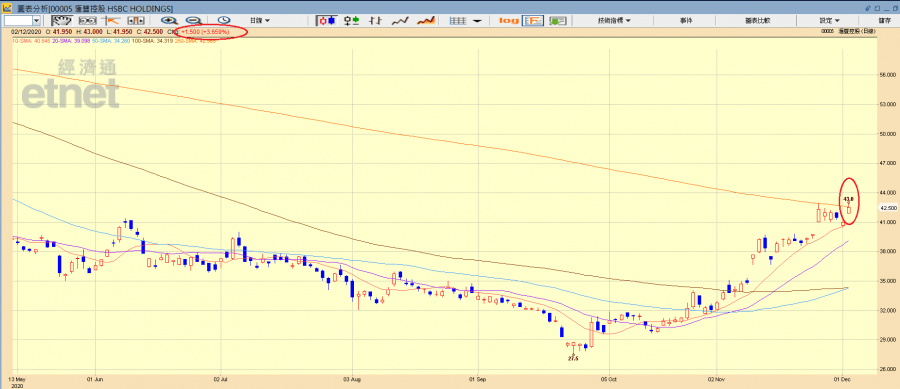 匯控(00005)升3.66%,報42.5元。(經濟通HV2系統截圖)