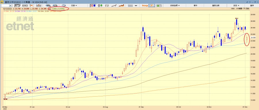 小米宣布配售10億股,配售價23.7元,另外發行本金額8.55億美元的零息可換股債券,上述所有事項完成後,及債券悉數轉換為股份,公眾股東所佔股權將由72.4%降至69%,集團承諾股份及債券買家均為獨立第三方。小米收挫7.07%,報24.3元,為恒指及科指表現最差成分股。