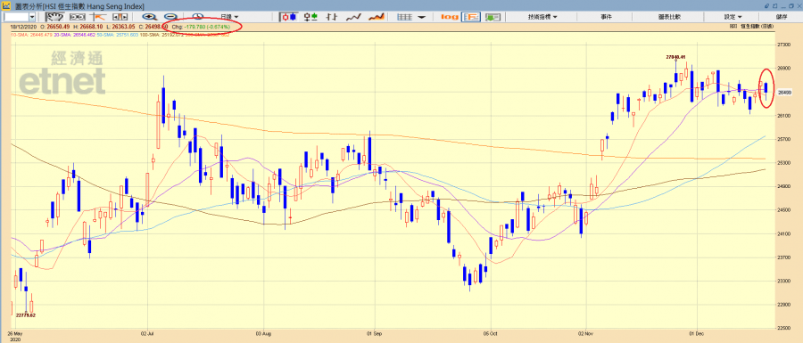 恒指本周在26127至26678之間上落,周一(14日)及周二(15日)各跌116點及182點,重磅科網股受累內地反壟斷政。本周中段在納指持續攀升下,港股反彈,恒指周三(16日)及周四(17日)分別回升253點及218點。今日為美國「四巫日」,恒指反覆收跌179點報26498。
