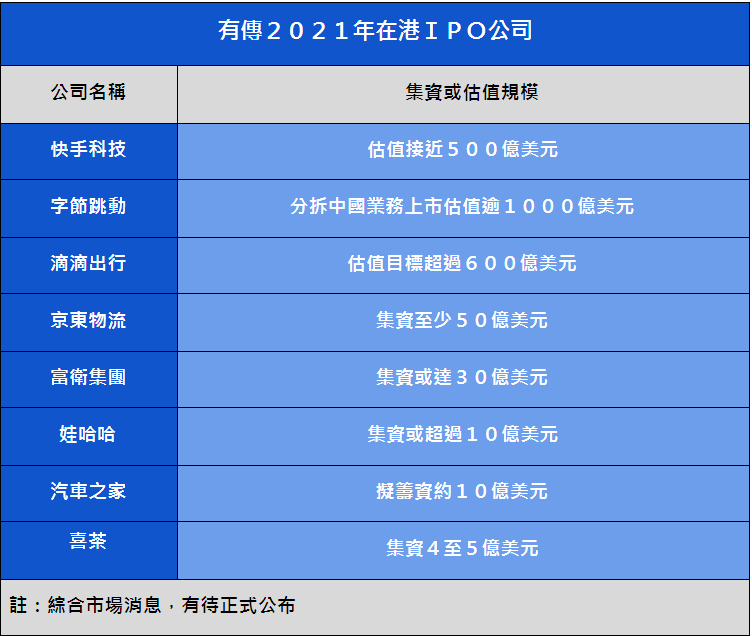 其他傳聞將明年上市公司中,黃偉康指滴滴出行、京東物流、喜茶等企業明年申請上市的機會較大,值得留意。其他有傳明年申請IPO的公司,亦包括中國短視頻初創公司快手科技、國內視頻巨頭字節跳動中國業務、保險公司富衛集團、內地最大飲料生產商娃哈哈,而已於紐約上市的中國線上汽車銷售網汽車之家據聞亦計劃於港第二上市,均值得投資者留意。