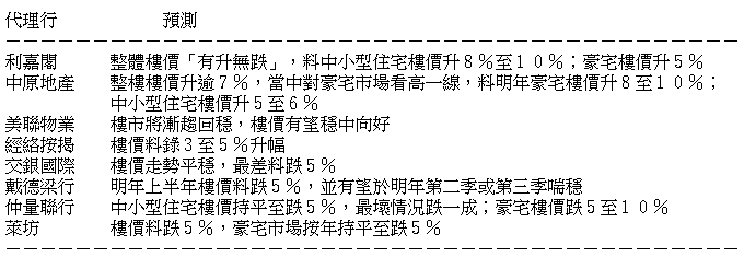 表列地產界對明年住宅樓價預測