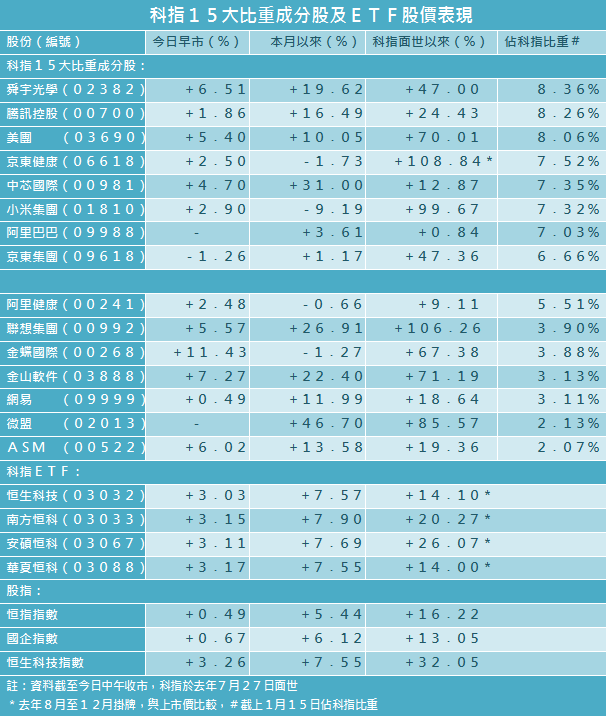 恒生科技指數今早突破九千大關,高見9094點創新高,科指ETF全線上揚。科指是於去年7月27日面世,半年下來累升逾三成,同期恒指升幅只有一成六,即使今年起計科指漲幅仍達7.6%,較恒指的5.4%升幅更為理想。加上近日資金再輪動至科技股,騰訊(00700)連升3個交易日後,今日延續強勢,輕微低開後曾倒升逾3%,創出667.5元的歷史新高,即使小米(01810)被美國國防部列入黑名單後股價下挫,今早亦止跌回升。投資者如有意對部署科指相關股份?