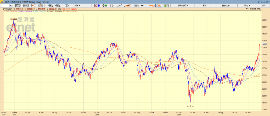 拜登周三(20日)正式宣誓就任美國總統,市場預計拜登入主白宮後,相關刺激政策將會立即出台刺激美股三大指數破頂。另外,人行繼續放水,今日公開市場開展2500億元人民幣的7天期逆回購操作,操作規模低於昨日的2800億元人民幣,中標利率維持於2.2厘。港股繼續上揚,半日曾升173點最高見30135,繼2019年5月再破三萬大關。