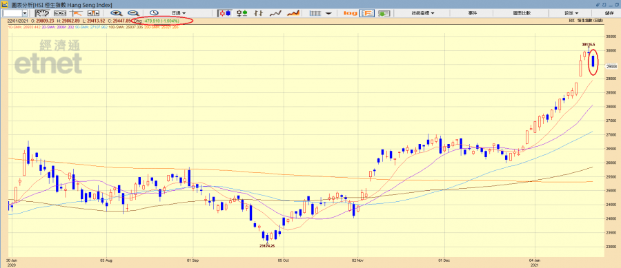 周一(18日)及周二(19日)北水湧入速度較快,美團(03690)、港交所(00388)、友邦(01299)等連番破頂,是推升大市的主因。周三(20日)開始北水淨流入有回落跡象,但恒指仍繼續逼近三萬關。拜登順利就任美國總統屬利好,恒指終在昨日成功突破三萬點關口,最高見30135點,騰訊(00700)亦觸及700元上市新高,惟港股後繼乏力,輕微低收。