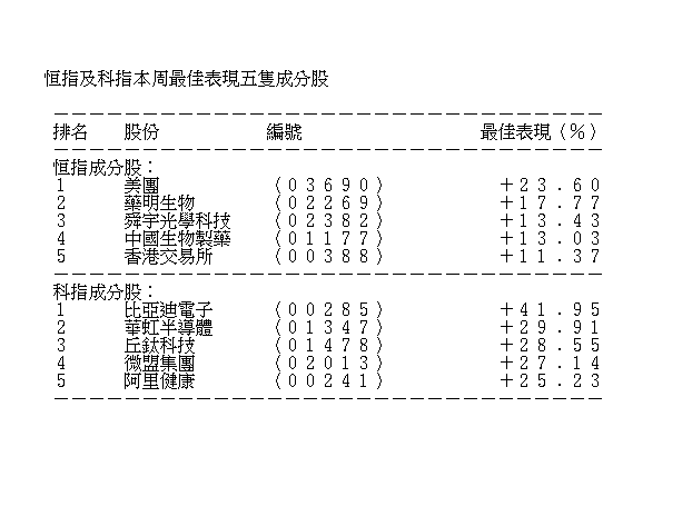 資金充裕下新舊經濟股齊漲,科指本周連續四日破頂,最高見過9981點,收報9765點,全周升11.28%或990點。