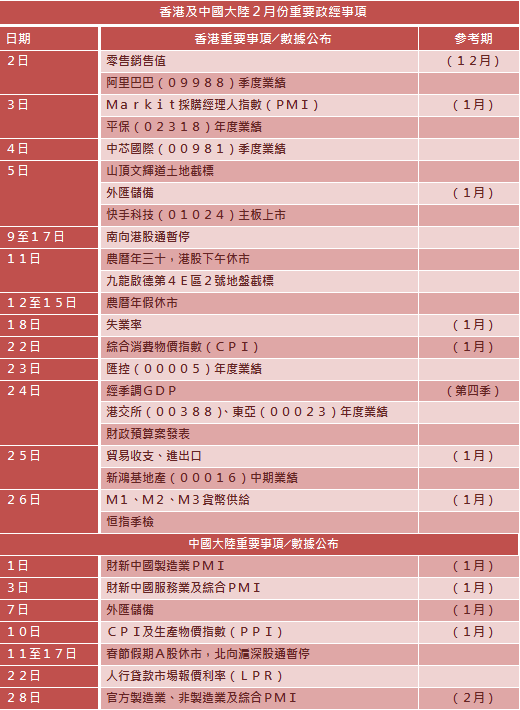 本月北水南下勢頭強勁,交投趨旺,除1月22日外,月內每日錄逾百億元北水淨買入,主板成交更於1月19日達3015.80億元創歷來單日最多。拜登順利就任美國總統令市場憧憬中美關係改善,其上任更提出1.9萬億美元刺激計劃,美國10年期債息上升至1厘水平,資金偏好風險資產,港美股市一同抽高。港股自年初起出現單邊升市,整月上揚約千點,曾突破三萬大關創廿一月高。展望2月份,預期科技股仍然是市場焦點,「ATMXJ」股應如何部署?