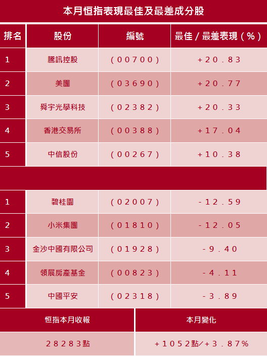 總結港股2021年1月走勢強勁,全月累升1052點或3.9%,高低波幅達3111點,最高見30191點,最低報27079點,收報28283點。港股連升四個月累漲4824點或20.6%。