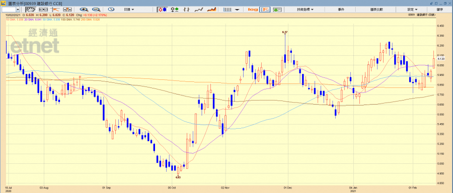 內銀股整體仍然橫行,升幅仍相對落後。何啟俊指,四大行內中行(03988)及農行(01288)仍受制於百天線區間上落,郵儲行及招行則不宜高追。建行(00939)在板塊中較值博,該股今日突破廿天線,換言之全面收復各主要平均線,趨勢向好,投資者如想部署可待回調至6元入手,但由於內銀板塊仍未被熱捧,認為短期只可上望6.6元附近位置,要有長線持有準備。