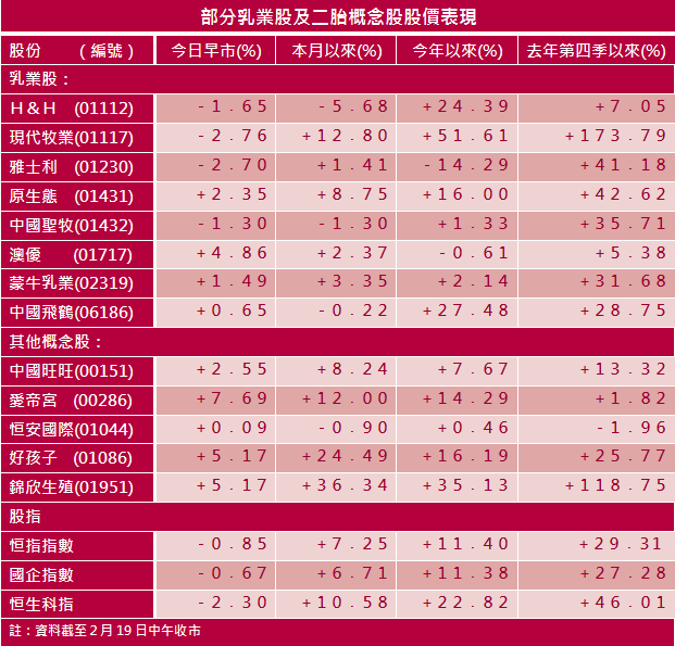 乳業股澳優(01717)早市升近5%,好孩子(01086)及錦欣生殖(01951)各升逾5%。不過,有分析認為,按往績看,即使上述政策落實,結果亦未必符合預期,相信對相關公司股價的刺激作用只屬短暫。