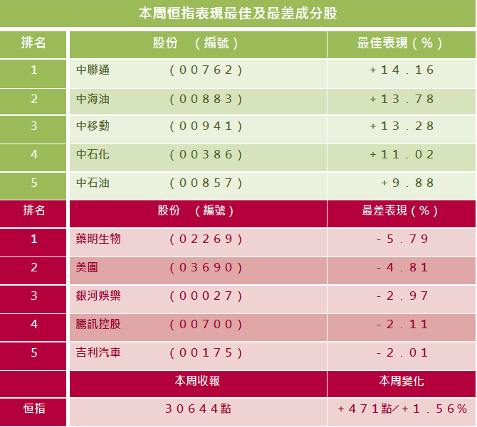 大市反覆,資金輪動炒作,流向電訊股。北水重臨後勁吸中資電訊股,中移動(00941)於周四錄北水淨買入39.9億元,為北水淨買入最多港股。中移動全周大漲13.28%,報53.75元;中聯通(00762)飆14.16%,報5.08元,為恒指及國指最佳成分股;中電信(00728)抽升16.22%,報2.58元;鐵塔(00788)彈9.82%,報1.23元。