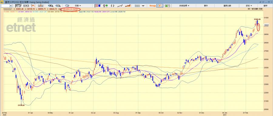 本周只有四個交易日,港股於周二(16日)大初五啟市,迎來「開門紅」,隨歐、日股高開高走,在科網、油股及地產股等藍籌表現下紅盤高收30746,飆573點。周三(17日),港股隨隔晚美股造好高開,科網、賭股及銀行股領跑,收升338點,報31084,創逾32個月高位。周四,A場復市,北水重臨下新經濟股卻獲利回吐,港股收跌489點,報30595,終止七連升,科指破萬一關創新高後倒跌。