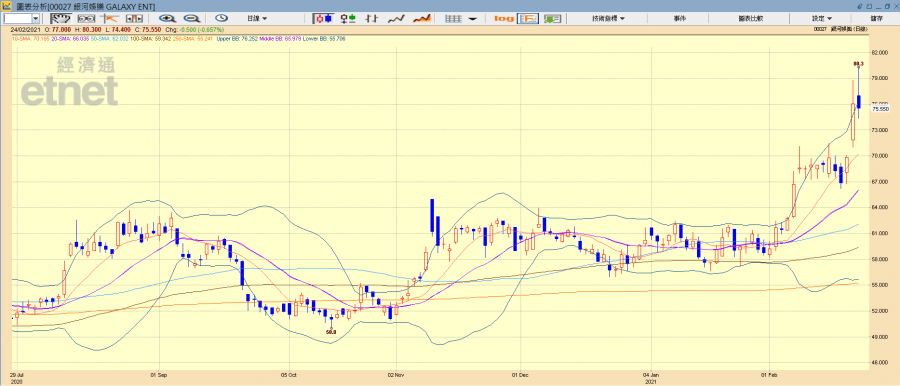 銀娛近日逆市尋頂,申萬宏源投資顧問部主管麥嘉嘉對《經濟通通訊社》表示,銀娛金沙等焦點賭股近日升勢過急,短期已累積一定升幅,澳門當局宣布所有由內地入境澳門人士毋須隔離是股價主要催化劑。但預計銀娛等賭股全年業續表現較差,現時升勢已反映市場對經濟復甦的憧憬,持股者可於高位分批減持,未持股者應待銀娛回調至70元水平才考慮建倉。她另提醒投資者,澳門六大賭牌於2022年屆滿,美資博企能否續牌存有隱憂,是投資金沙一大風險。