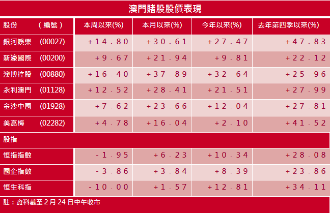內地入境澳門毋須隔離的新政更令市場憧憬賭收復甦。匯豐證券發表研究報告指,北京及廣州簽證申請在農曆新年後增加,而中場及貴賓表現亦帶動澳門博彩總收入(GGR)上升。