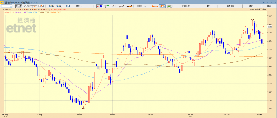 投資部署方面,他指出,作風穩陣的投資者,可選擇四大內銀股,包括建行(00939)、工行(01398)、中行(03988)及農行(01288),當中首選建行,建議6.2元下買入,目標價7元,穿二百五十天線(約5.833元)止蝕;進取者可買渤海銀行(09668),現價買入,博反彈上4.4元,若跌至低於買入價一成,應要止蝕。