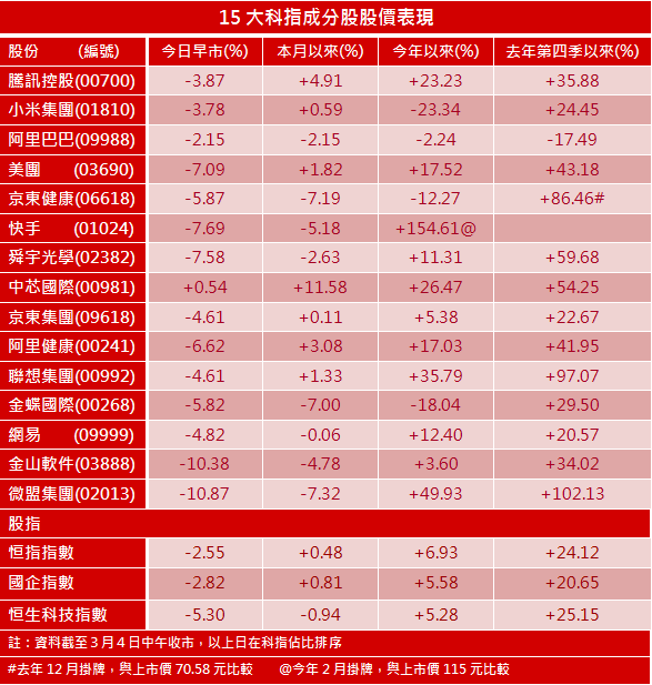 美國十年期債券孳息率上升,暫報1.481%升0.011個百分點,再度逼近1.5厘,息升影響企業借貸成本,科技股急跌。隔晚納指收跌近3%,今早港股急挫,恒生指數半日收29118,跌762點或跌2.55%,恒科指數報8870,挫496點或跌5.3%。科指早市曾低見8866點,為約一個半月低位,跌穿50天線(約9311點),自2月18日歷史高位11001點計,回落19.4%,一般分析指,股指若由高位回落超過兩成,技術上步入熊市。然而,科指與250天線(7091點)比較,目前仍有一段距離。