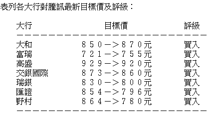 富瑞則讚騰訊去年第四季非遊戲業務表現優於該行的預測,而公司正在實施開放平台戰略,並強調會完全遵守法規,而海外遊戲亦持續擴張,相信手遊收入按季下跌是受季節性因素影響;至於視頻業務則尚處於開發的初期階段,目前重點不在變現,將騰訊目標價由721元,上調4.7%至755元,維持「買入」評級。